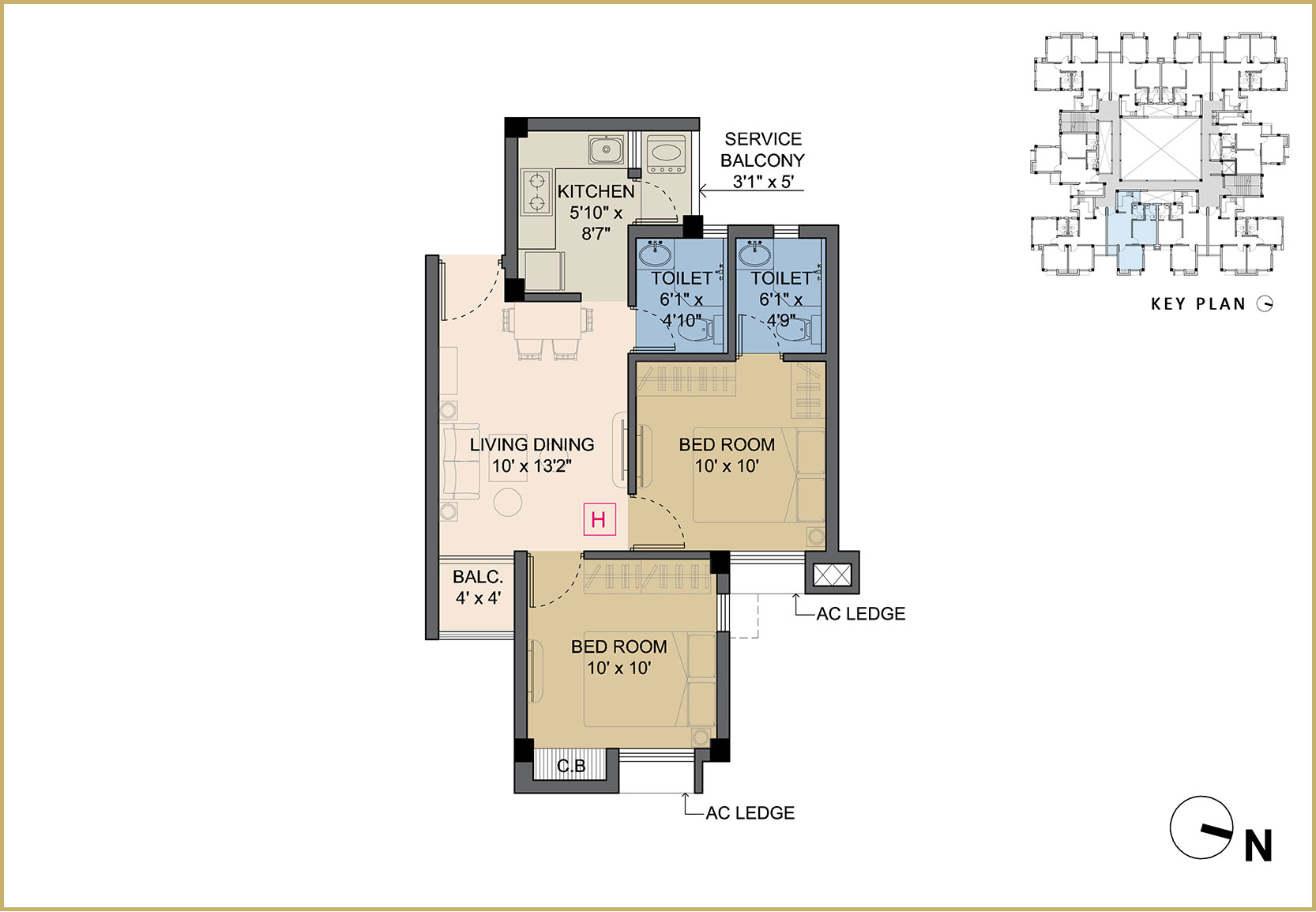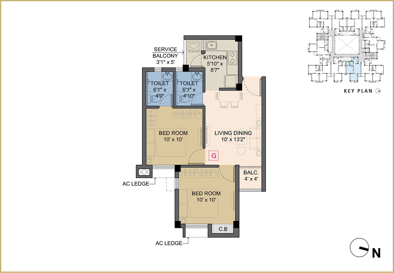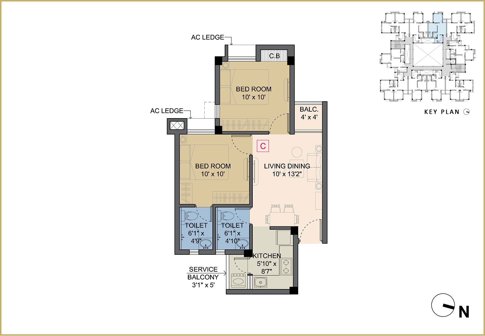 - Colour anodized / Powder coated aluminium sliding windows with clear glass and window grills. Large Aluminium sliding doors in between Living Room and Balcony